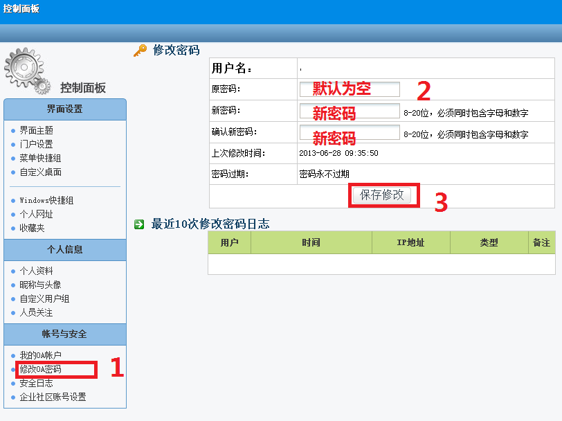 【個(gè)人事務(wù)】--【控制面板】--【修改OA密碼】