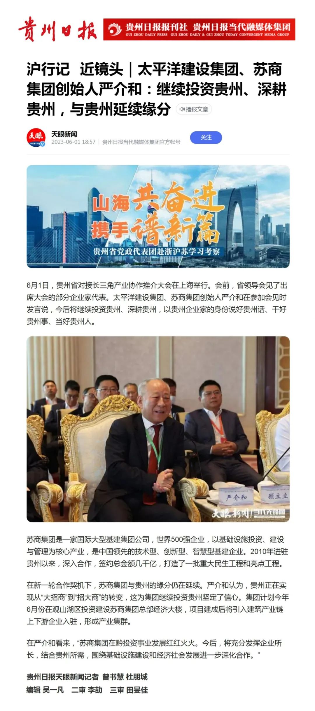 資訊:6月1日,貴州省對接長三角產業(yè)協(xié)作推介大會在上海舉行。會前,省領導會見了出席大會的部分企業(yè)家代表。太平洋建設集團、蘇商集團創(chuàng)始人嚴介和在參加會見時發(fā)言說,今后將繼續(xù)投資貴州、深耕貴州,以貴州企業(yè)家的身份說好貴州話、干好貴州事、當好貴州人。