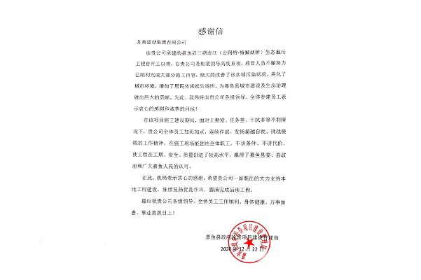 蘇商建設(shè)第十集團(tuán)收到湖北省嘉魚縣政府投資項目建設(shè)管理局感謝信